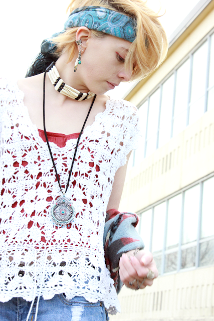 Top: thrifted • Red bustier: Sparkle and Fade (Urban Outfitters) • Jeans: Eyeshadow • Shoes: Etsy • Ruana: Staring at Stars (Urban Outfitters) • Headband: borrowed • Earrings and choker: Hyannis, Cape Cod • Ear cuff: Ebay • Necklace: Forever21 • Bracelet: Waloosi's, North Leominster